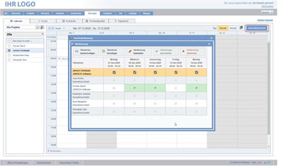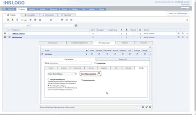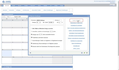 Übersicht, allgemeine Einstellungen, Firmenname, Logos und Bilder, E-Mail Konten, Empfänger für Anfragen, Berichtvorlagen, Logos, Briefkopf, Brieffuß, meine Einstellungen, E-Mail Signatur, Benutzerfarbe, Anwendungseinstellungen,...
