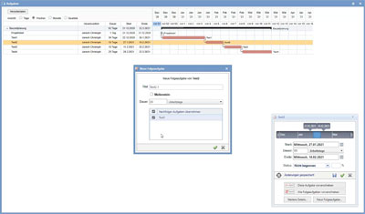 Projektzeitplanung, Ressourcenplanung, Bauzeitplanung, Ordneransicht, Gantt Bearbeitung, Verknüpfungen, Ansichten, Dauer in Arbeitstagen oder Arbeitswochen, Feiertagsberechnungen, Meilensteine, Ressourcen, Tagesansicht, Wochenansicht, Monatsansicht, Quartalsansicht, Gantt Diagramme drucken, Aufgabenzuordnung, Eigenschaften, Ressourcen, ToDo Listen, E-Mails, Anpassungen, Soll-Ist Vergleich, Import, Berichte, Zeiterfassung, mobile Version,...