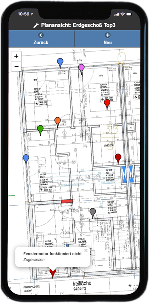 Sie erfassen Mängel bequem mit Ihrem Smartphone oder Tablet. Dort verorten Sie den Mangel auf digitalen Bauplänen und erstellen Fotos, Videos, Notizen und vieles mehr.